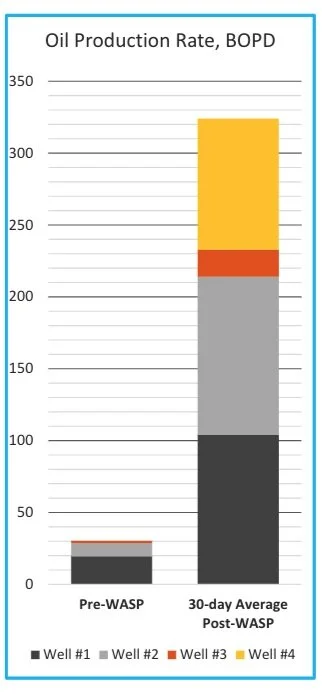 The aggregate oil production for the first 30-days averaged 324 BOPD, up 970% from the pre-BLUESPARK® aggregate of 30.3 BOPD, including one well (Well #4) that had zero production pre-treatment.