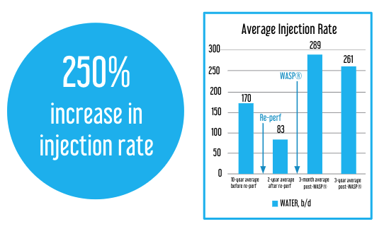Well had initially been a producer that was converted to an injector. Injection rate was adequate for 10 years, then sharply declined. The original interval with an additional 20% was re-perfed with marginally better results, but within 2 years the pressures increased and rates dramatically decreased. The client wanted to try a different type of technology to obtain better, longer lasting results.