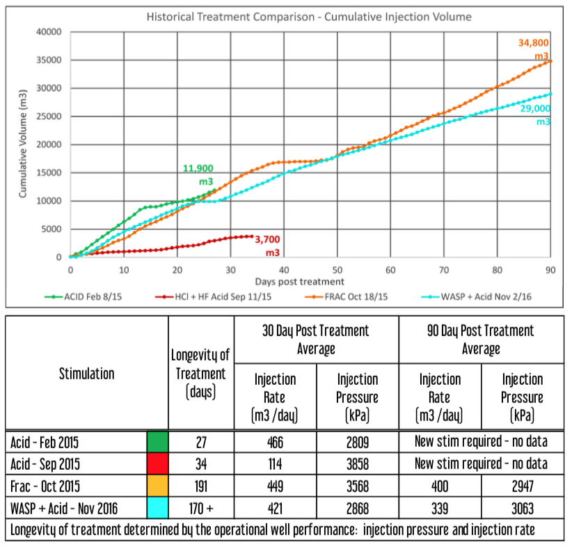A 5 year old disposal well was experiencing reduced injection rates and increased injection pressure. Over a 2 year period, 20 stimulations were conducted, averaging one treatment every 33 days.