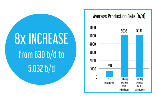 Client data from the BLUESPARK® treated well showed an average production increase from 100m3/d (630 b/d) to 800m3/d (5,032 b/d) over a one-month period.