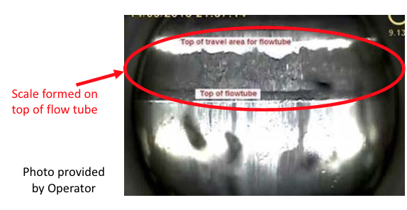 There was also a Wireline brush stuck below the SV flapper at an unconfirmed depth. Calcium Carbonate scale was seen in the flow tube area and in the tubing above the SSSV.