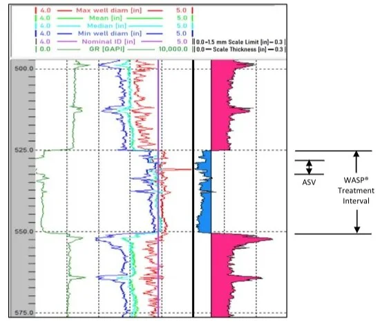 A multi-finger caliper (MFC) was run over the treated and untreated sections of the wellbore for comparison to the previous caliper log.